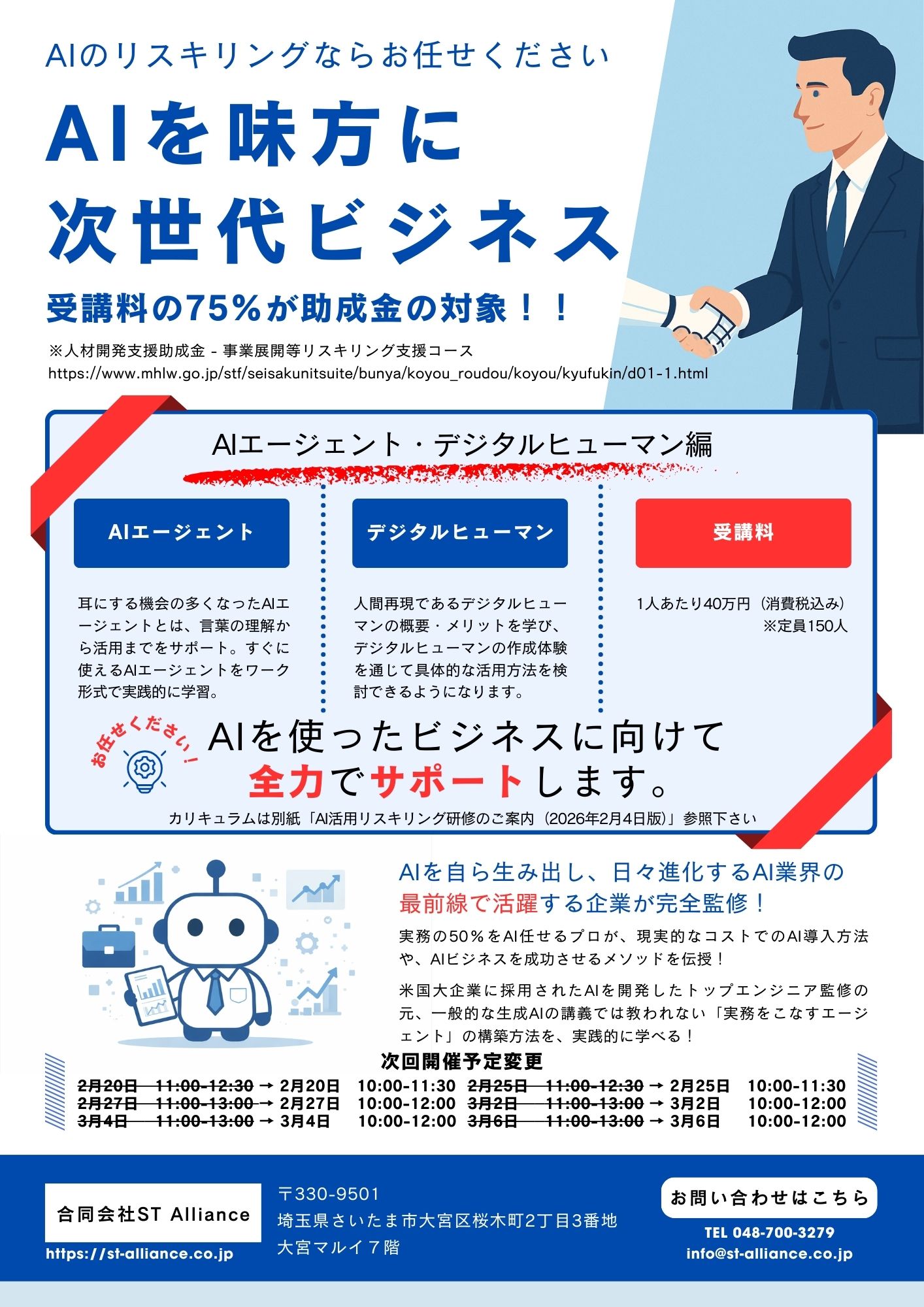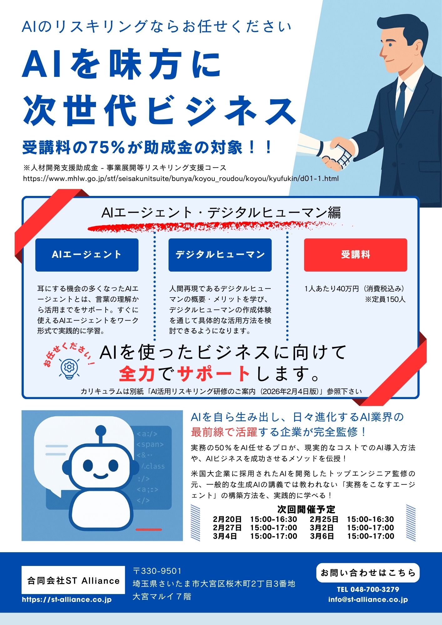 デジタルテクノロジー・メタバース環境・AI システムの基礎理論を学び、現場の課題解決に直結する生成AI活用型デジタルヒューマンの実装を実現するトレーニングです。