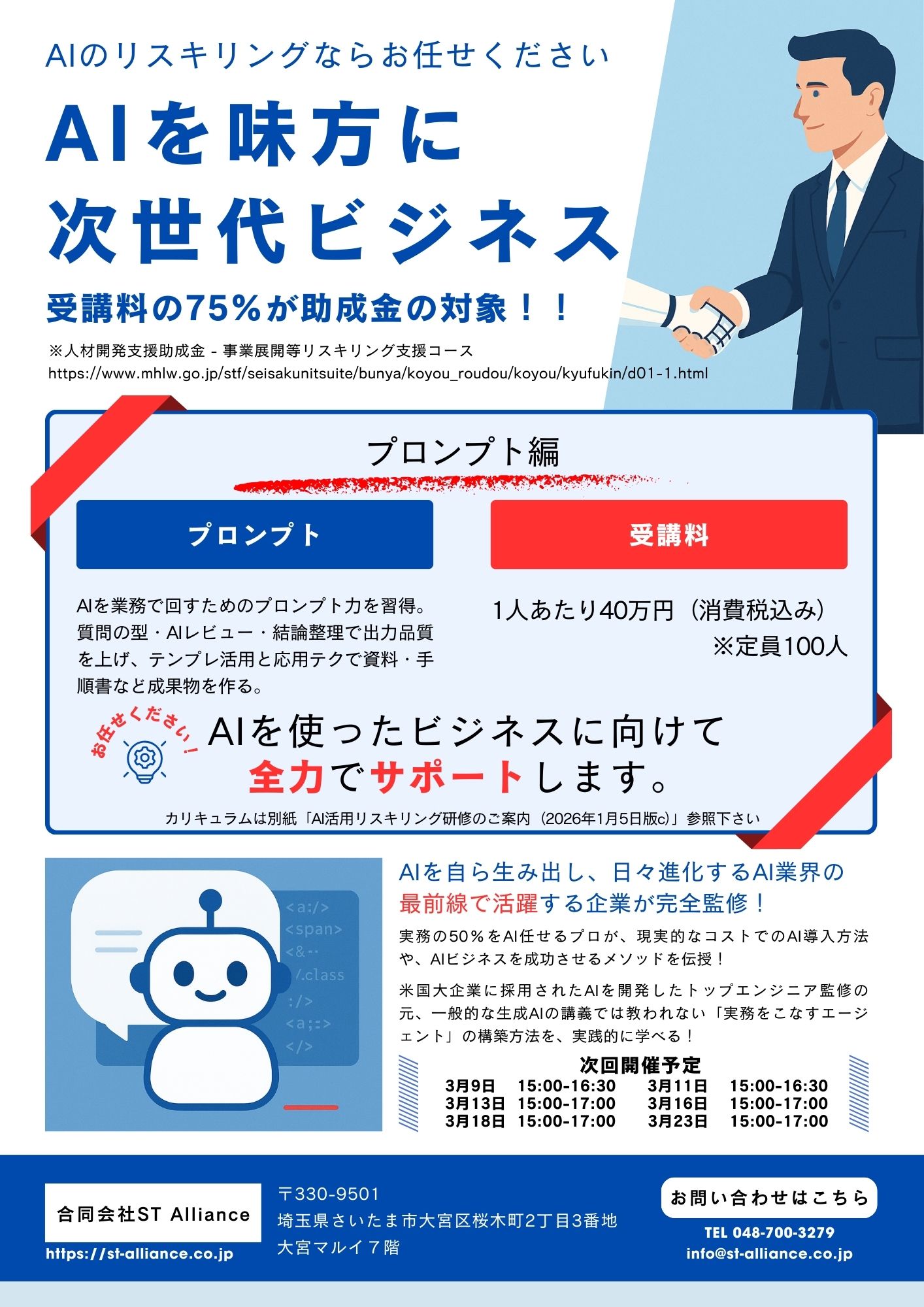 日常業務の効率化から専門的なタスクまで、AIを使った業務改善手法を習得。Excel関数の自動生成、プログラミング支援、創造的なコンテンツ制作など、人材不足を補う実践的なAI活用スキルを身につけます。